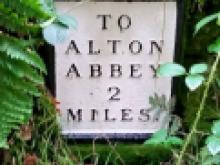 Mileplate on Earl's Drive, Dimmingsdale A listed early 19th century (c1807) cast-iron mile plate set into a drystone wall on the former drive leading to Alton Towers from Threapwood Lodge. The mile plate gives the distance to Alton Abbey, the previous name for Alton Towers when lived in by the Shrewsbury family. Our ref AL14/15 SK 04254325 Alton, Dimmingsdale, Oakamoor |